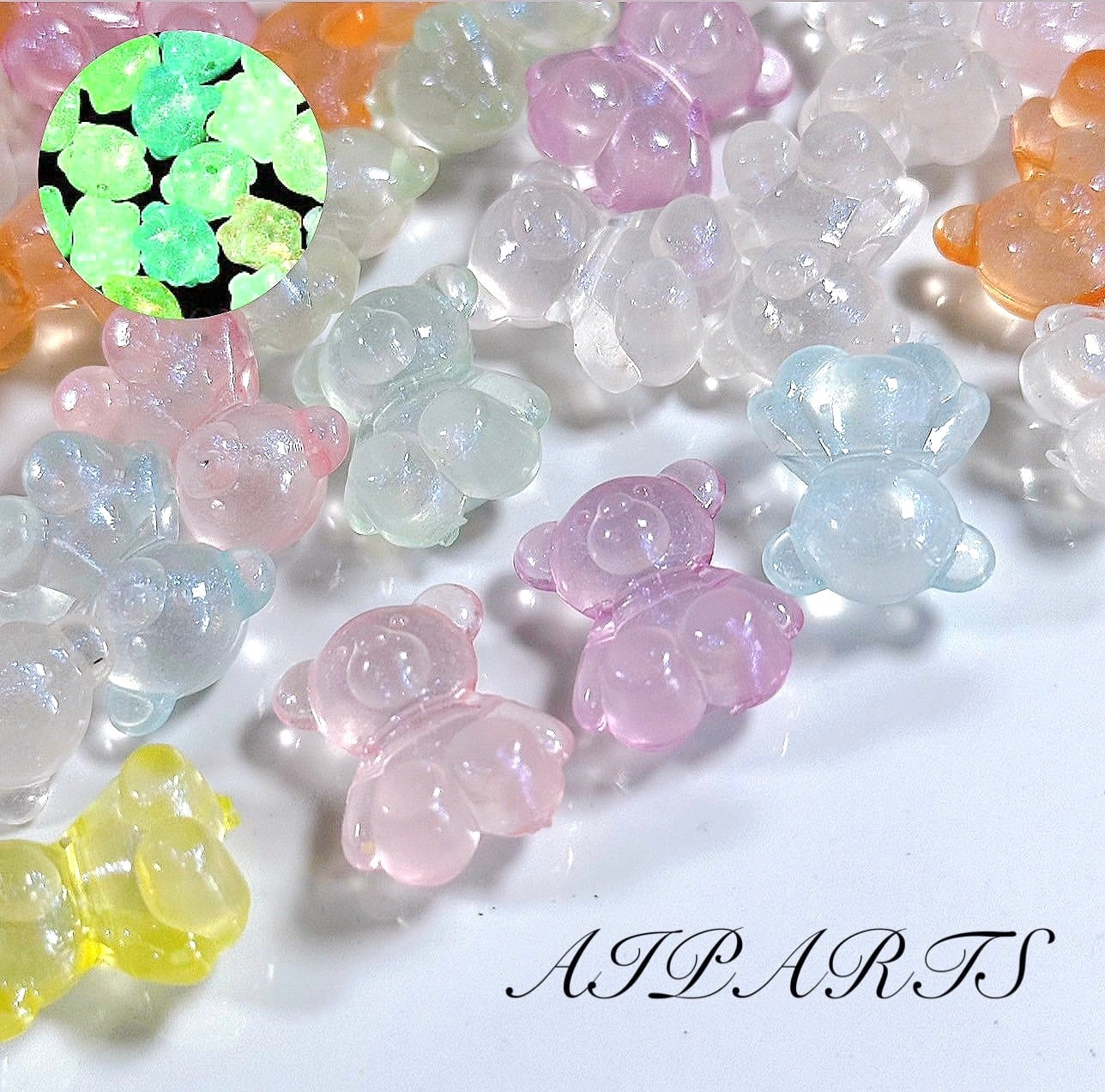【大袋の卸販売も在庫あり】ハンドメイド資材 素材 アクリルビーズ 横穴 クマ 熊 くま ベア カスタムビーズ カスタムパーツ ゼリーカラー 半透明 ラメ入り 夜光 蓄光 光るビーズ