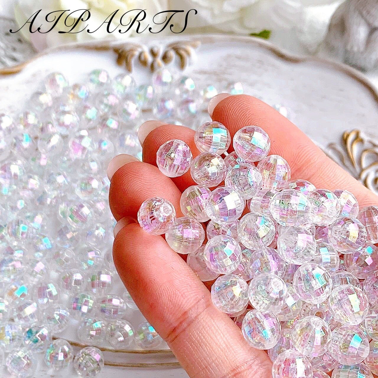 アクリルビーズ 8mm 多面カット 多角 オーロラ加工 虹色メッキ ABメッキ ハンドメイド資材 ハンドメイド素材 DIY素材 アクセサリーパーツ
